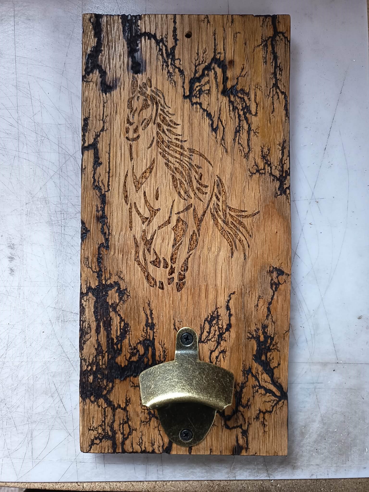 décapsuleur murale cheval en chêne et fractale vernis avec trou de fixation dessin fait au pyrograveur
