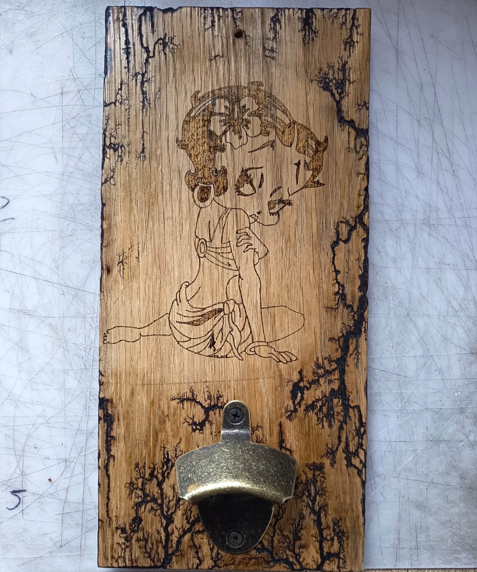 décapsuleur murale betty boop en chêne et fractale vernis avec trou de fixation dessin fait au pyrograveur